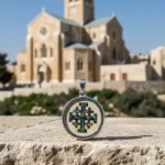 A luxurious and meaningful piece handcrafted in the Holy Land from authentic Jerusalem stone, beautifully set in a solid Sterling Silver 925 frame. The engraved cross design is enhanced with natural mother-of-pearl inlay, adding a luminous, iridescent glow that reflects light in elegant shades of green, blue, and gold.