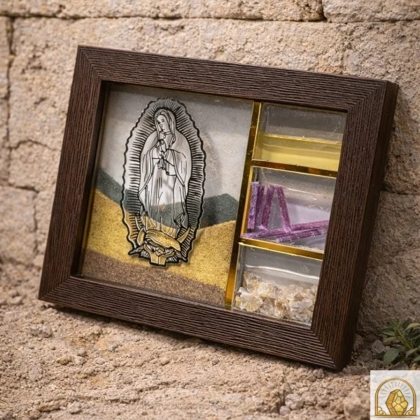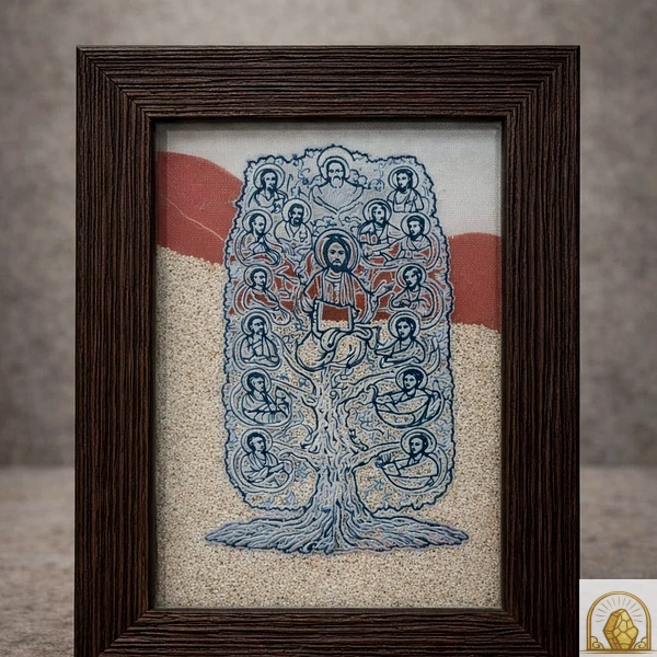 Made in the Holy Land, this unique artwork combines a high-quality wooden frame with protective glass and a detailed sacred image. Inside the frame are two layers of natural moving sand, creating a subtle and elegant visual effect that gently shifts over time, adding life and depth to the piece.