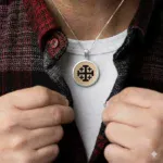 A meaningful piece of the Holy Land, beautifully handcrafted from authentic Jerusalem stone and set in high-quality Sterling Silver 925. This unique necklace features a finely engraved religious symbol, elegantly framed in polished silver, highlighting the natural beauty, texture, and character of the sacred stone.